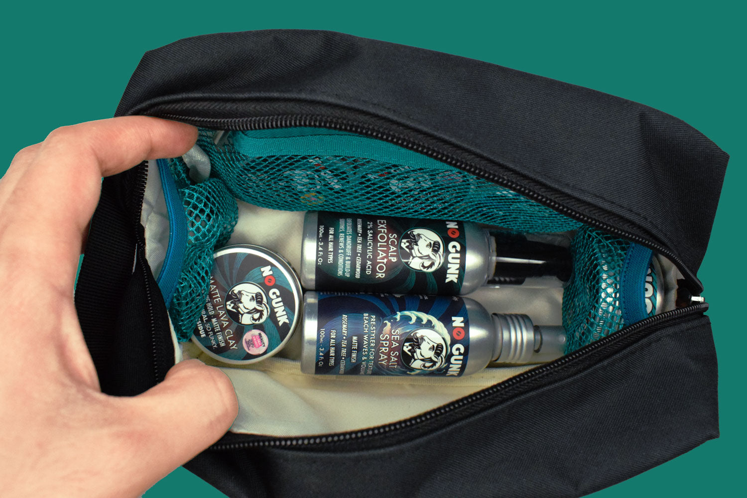Trousse de grooming 100% polyester ultra résistante avec le logo NO GUNK et une poignée pour la transporter facilement ou l’accrocher.