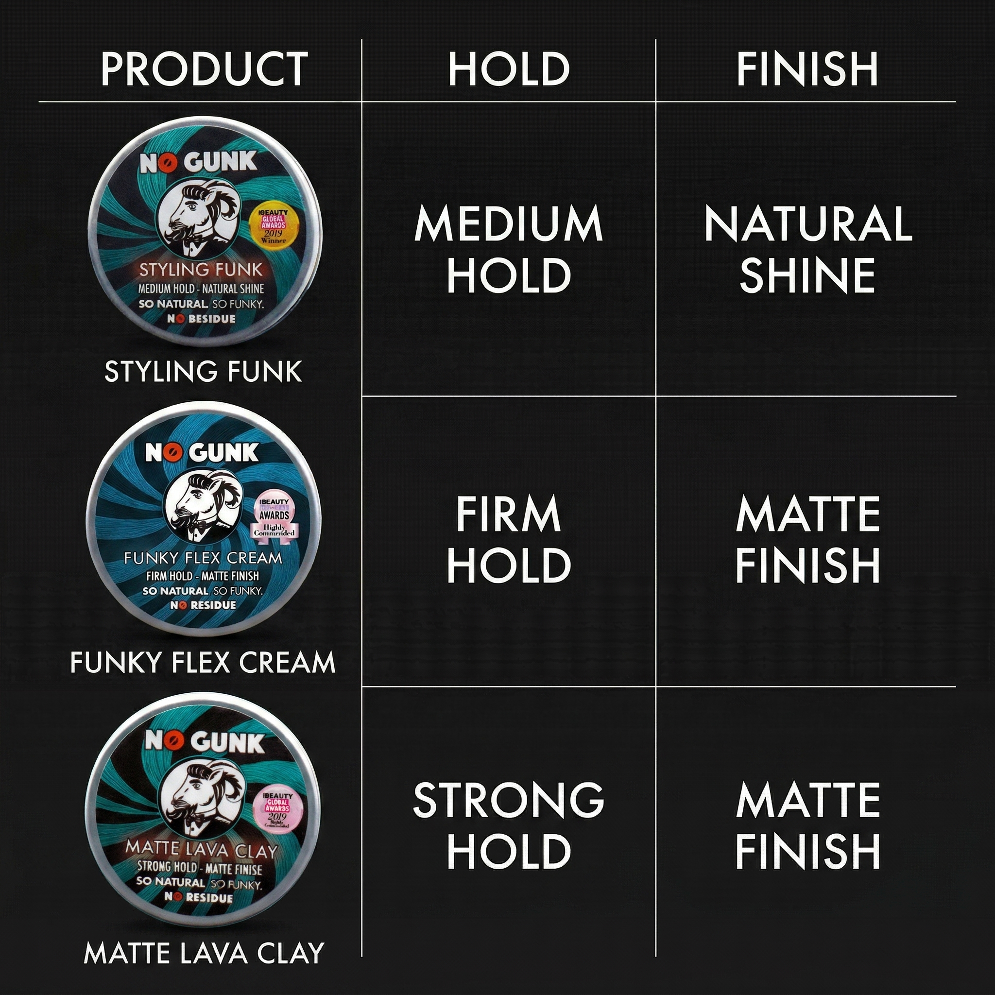 Présentation de la NOUVELLE Argile de Lave Mate NO GUNK : Une argile coiffante mate naturelle pour cheveux, sans produits chimiques, à base d'argile de lave marocaine riche en minéraux. Elle donne un aspect naturel texturé avec un fini mat à vos cheveux. C’est la fusion parfaite entre ingrédient naturels et style qui se glisse dans votre poche, idéal pour les voyages et les déplacements. Avec sa consistance agréable et légère, elle ne laisse aucun résidu sur les mains ou les cheveux après utilisation. Elle sent tellement bon qu'on pourrait même être tenté d’en manger. Rejoignez la révolution de Mat Lava Clay Funky Fellas. JUSTE FUNK !